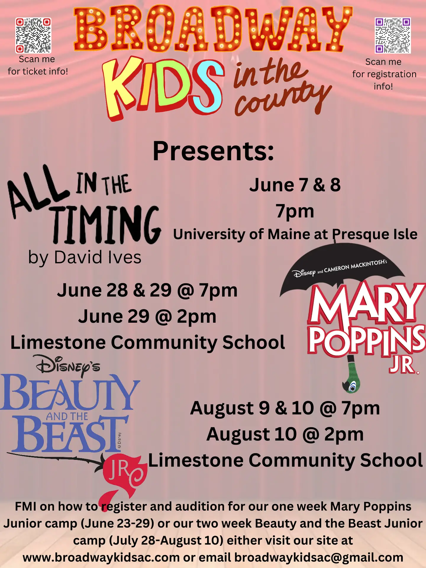 Come out to see what our amazing campers have learned after a week of intensive rehearsals! The campers range from grades 1st-8th. Not only do the kids fully learn the show in the week, they also design and make the set and the props! It’s always amazing what these kids can pull off in just one week!